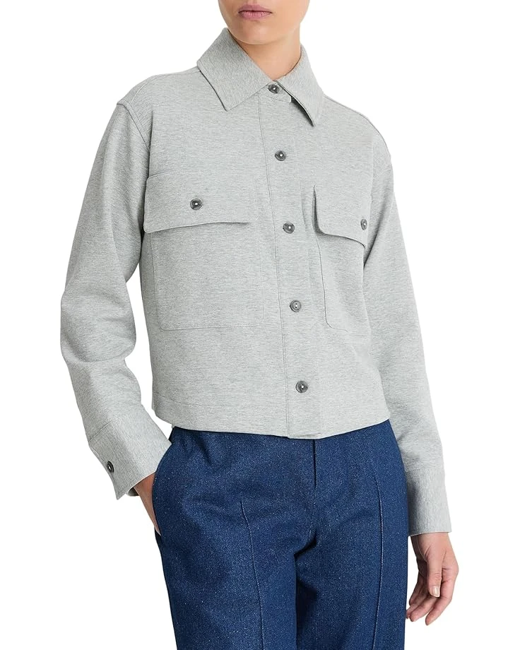 - Complement your effortless style on chilly weather days in the Vince® Cropped Jacket. Featuring a spread collar with a front button-closure, long sleeves with button-closure cuffs, button-closure chest pockets, and a straight hemline.