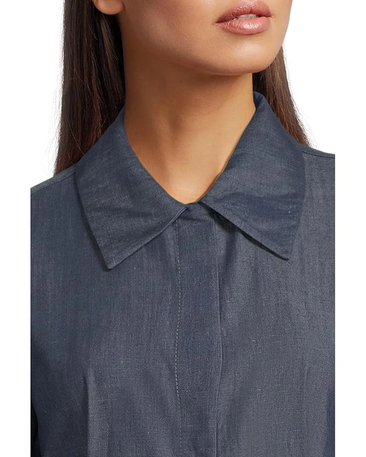 - Amaze everyone with your sleek and stylish aesthetic by donning the Vince® Denim Short Sleeve Shirt Dress. The full-pleated A-line dress features a collared neck, short sleeves, a hidden-button placket, two hand pockets, and a midi-length silhouette.