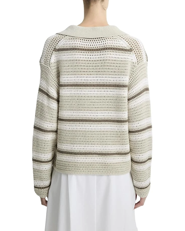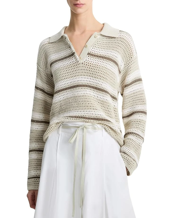 - Designed with an open mesh-knit construction, the Vince® Mesh Stripe Button Polo sweater is the perfect weight that moves through seasons with ease. It has a collared V-neckline with buttoned placket and drop shoulder long sleeves.