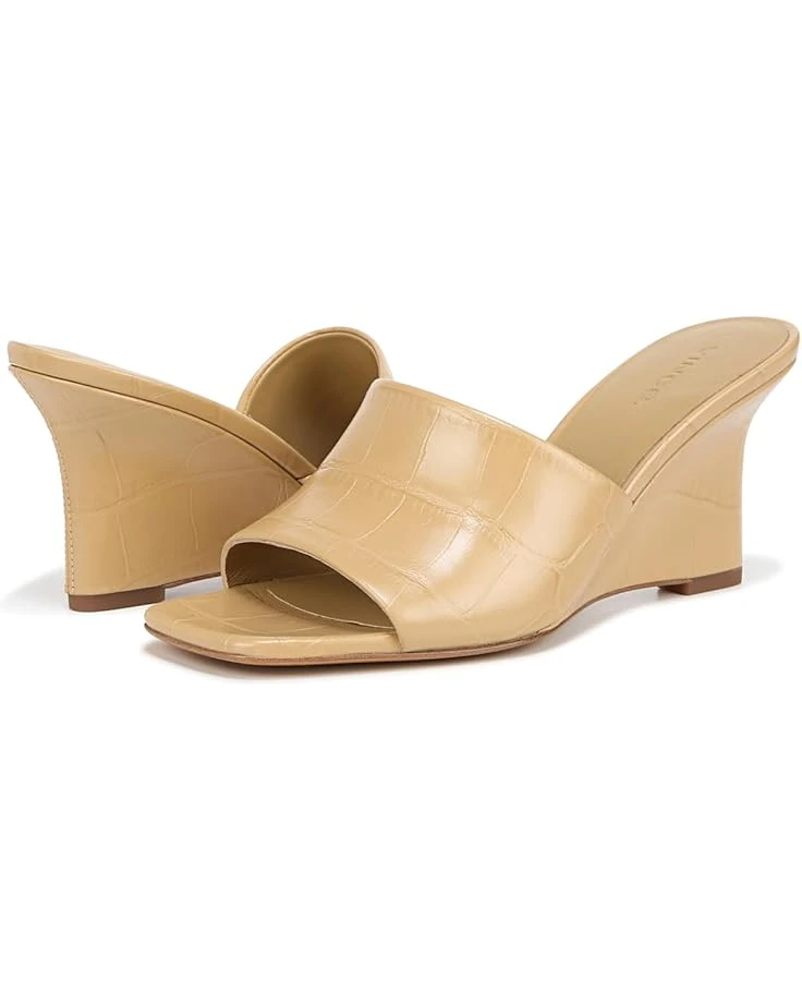 - Go to dinner night or a friend’s get-together wearing the Vince® Pia-2 sandals. Crafted from leather upper, the sandals are designed for an updated style. A leather lining and foam footbed enhance comfort while walking. The sandals have an open toe, slide-on style, a luxe croc-embossed texture, and sculptural wedge heel.