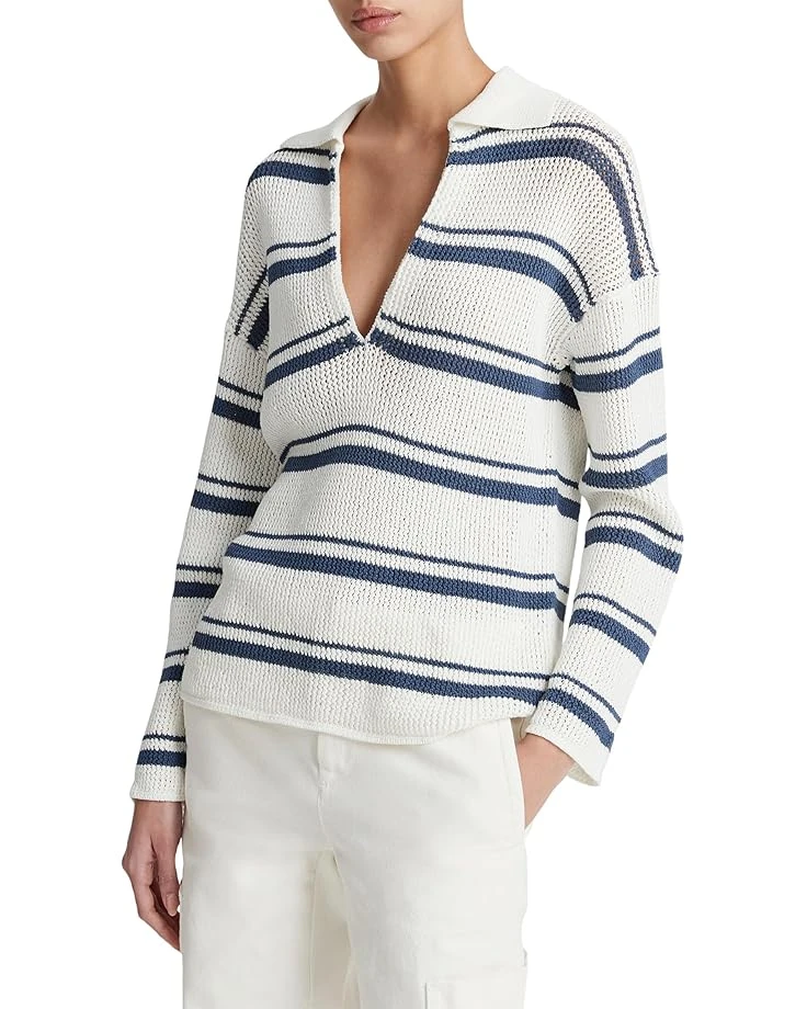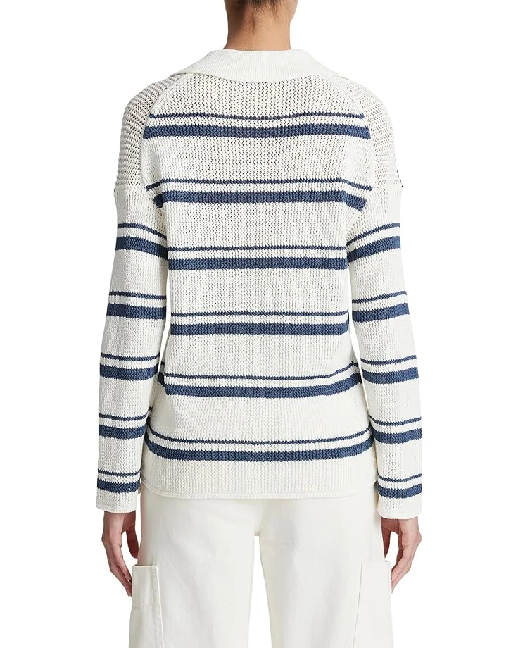 - The Vince® Racked Ribbed Stripe Pullover is crafted from a soft Italian organic cotton blend that offers superior comfort and warmth. This knit pullover comes with long raglan sleeves and a collared neckline. The open gauge chunky knit fabrication makes it an ideal choice for the cold weather. Perfect to style with casual trousers and trendy denim, this ribbed sweater works for different occasions.