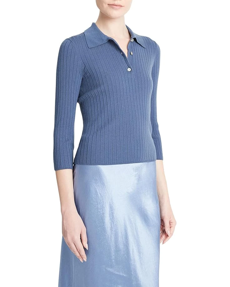 - Pretty and grace-radiating, the Vince® Ribbed Button 3/4 Sleeve Polo tee features an allover ribbed texture in a wool blended jersey with a polo collar, henley-buttoned neckline, and three-quarter-length sleeves.